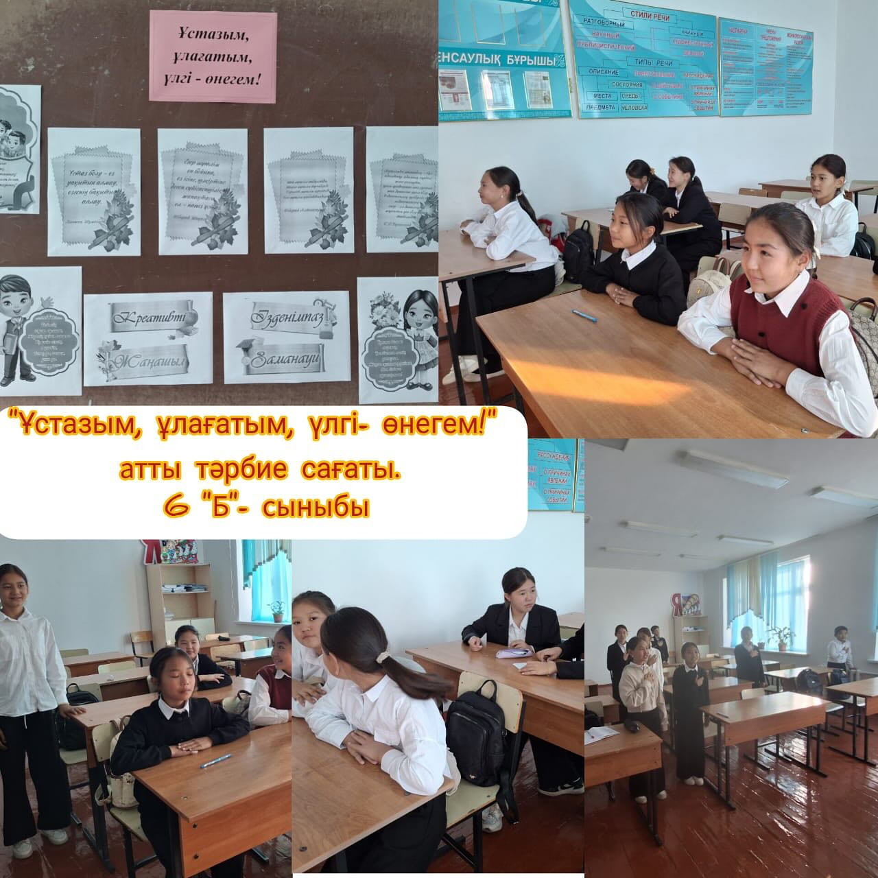 М.Мәметова атындағы №13 жалпы орта білім беретін мектебінің 6”Б”- сынып оқушылары “Ұстазым, ұлағатым, үлгі - өнегем!” атты тәрбие сағатын өтті . Тәрбие сағаттың мақсаты: Ұстаз мамандығының қыры мен сырларын түсіндіру. Оқушыларды ардақты да аяулы ұстаздарын құрметтеуге, сыйлай білуге үйрету, адамгершілікке, сүйіспеншілікке тәрбиелеу және зиянды бағдарламалардан аулақ болуға үйрету.