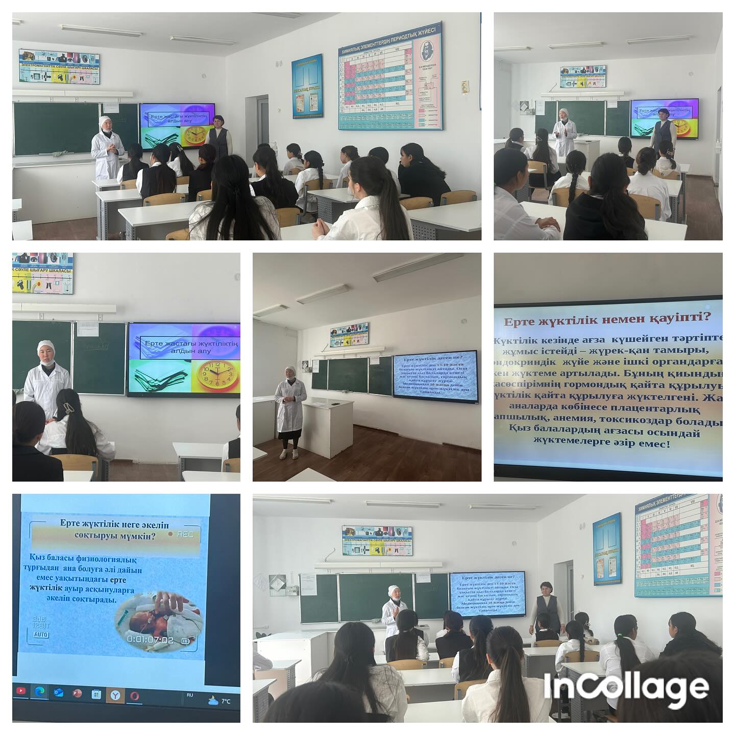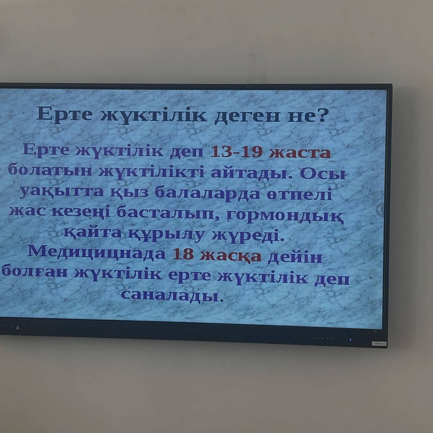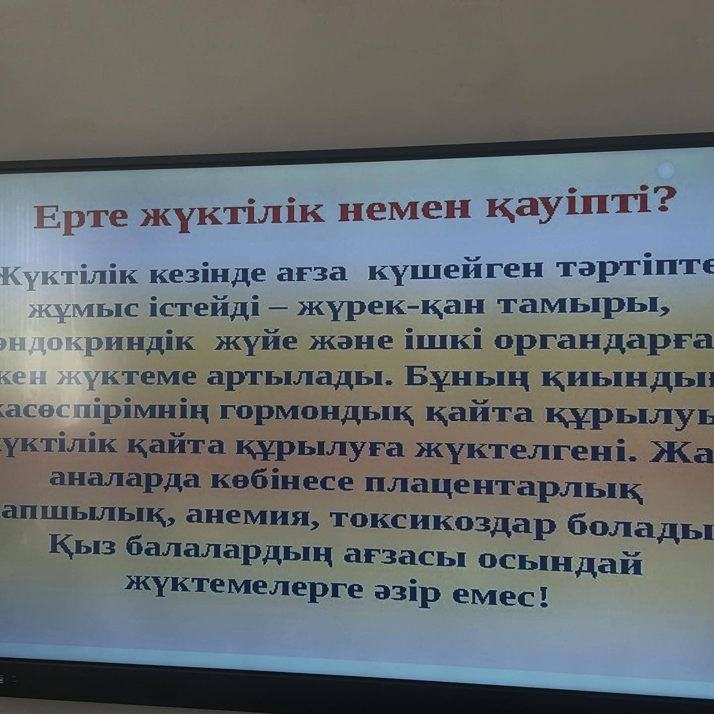 Ерте жүктіліктің алдын алу мақсатында түсіндірме жұмыстарын жүргізіліп, бейнеролик көрсетілді. Гигиеналық талаптардың(бас, тырнақ, мектеп формасының таза болуы) сақталу керектігі айтылды.Беймезгіл уақытта көшеде жүрмеу, танымайтын адамдармен әңгімелеспеу және онымен қараңғы жерлерге, адам жоқ орындарда қалмау керектігі, сондай-ақ зиянды әдеттерден аулақ болуға, әлеуметтік желілерде ұзақ уақыт отырмауға кеңестер берілді.