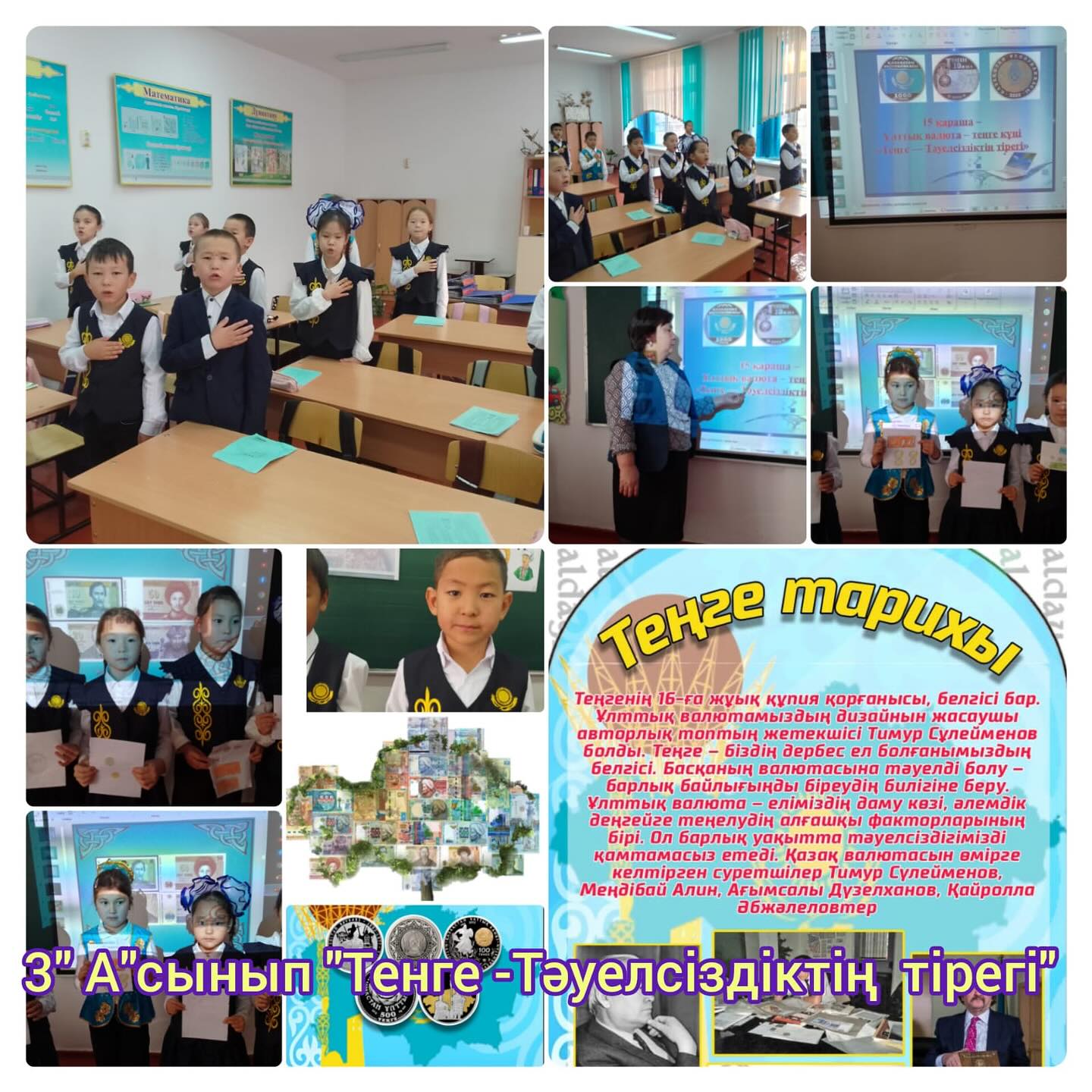 Сынып сағаты барысында білімалушылар тенгенің шығу тарихымен танысты.Тенгенің ел тәуелсіздігін дегі рөлі туралы әңгімелер,әртүрлі номиналды банкноттар мен тиындарды көріп олардың бейнелерін талдады.Сонымен қатар білімалушылар “Тенге -ел қазынасы “ атты сурет көрмесін ұйымдастырып,тенге туралы мақал -мәтелдер айтып,сұрақтарға жауап берді.Сынып сағатында ұлттық құндылылығымыз тенге туралы көптеген мәліметтер алды.
