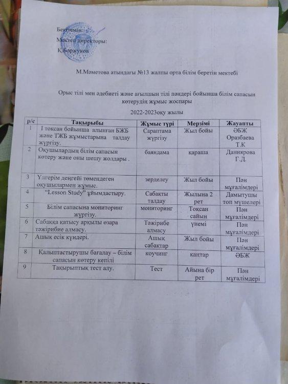 31.10.2022 жылы орыс тілі мен әдебиеті және ағылшын тілі пәндері бойынша кезекті бірлестік отырысы болды. Күн тәртібінде қараған мәселелер: 1. Орыс тілі мен әдебиеті және ағылшын тілі бойынша білім сапасын көтерудің жұмыс жоспарымен таныстыру. (ӘБЖ Оразбаева Т.К.)